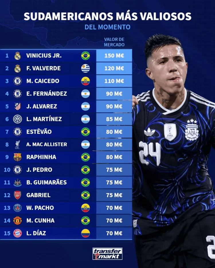 虎扑04月12日讯 德国转会市场盘点了目前身价最高的南美球员,详情如下: